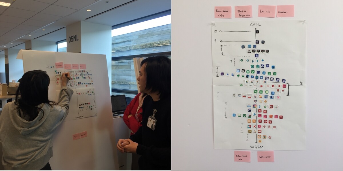 COOL – WARMの一軸上にデザインスプリントで作ったアイコンを並べていきました。色のチョイスが印象に大きな影響を与えることがわかりましたが、モチーフ(イラストレーション|抽象モチーフ)、ストローク(細い|太い)などが印象にどんな影響を与えるのか?といった考察を皆で出し合いながら、楽天のアプリアイコンが目指すべきスタイルの規定をステップバイステップで進めていきました。