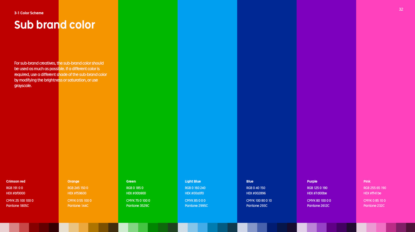 しかし、80を超えるサービスブランドが、それぞれのマーケットで差別性を図る上でクリムゾンレッドでいいのか?個性を表現し、活かすということはできないのか?という観点から、私自身が色の拡張について佐藤可士和氏、三木谷社長に提案を行い、新たに6色が公式ブランドカラーとして追加されたのでした。