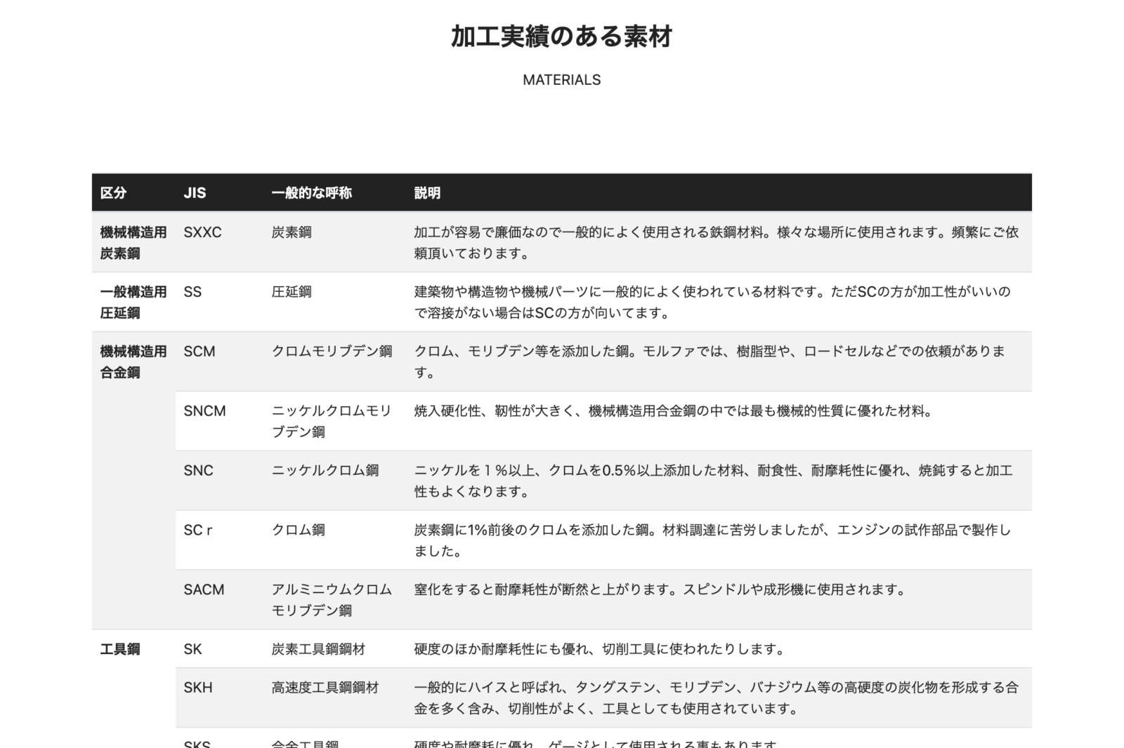 加工実績のある素材を明示することにしました。