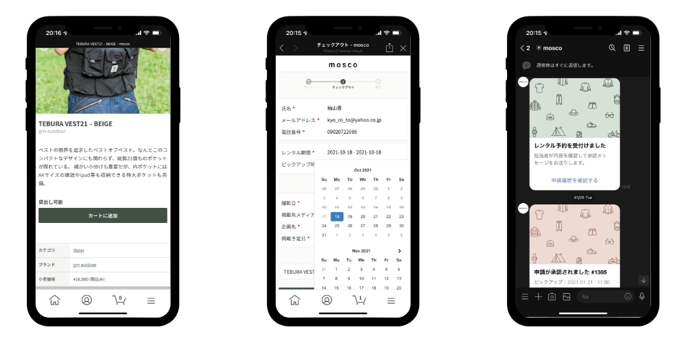 忙しいスタイリストがLINE上でmoscoの所有する全アイテムを閲覧することができ、レンタル申請も簡単に行える。
