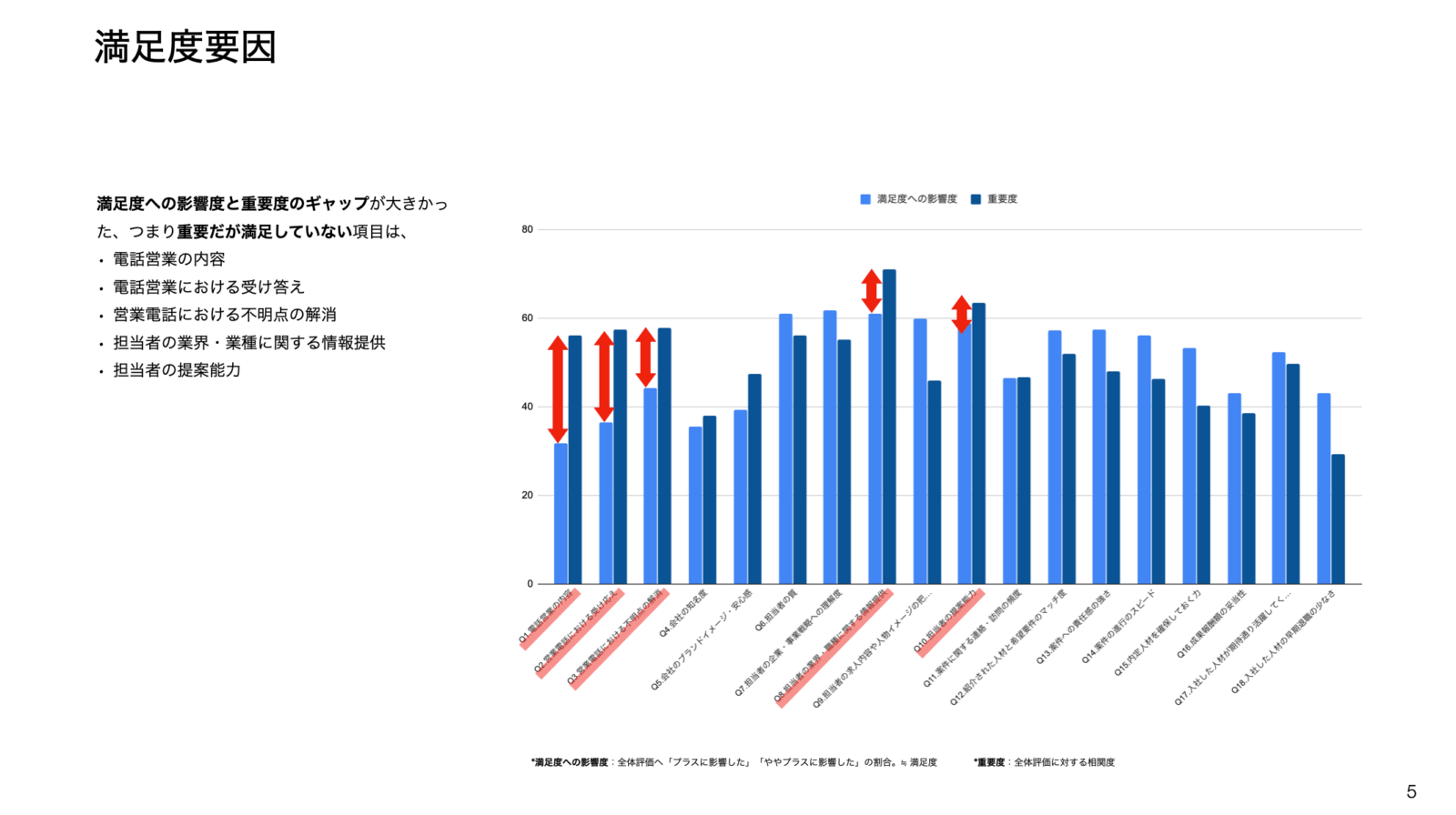 満足度と重要度とのギャップ、つまり顧客は重要だと考えているが満たされていないことでは、電話営業に関する事項について若干の乖離が見られました。Pole&Lineは、PUSH型営業だけをしているわけではないので、実態と設問のギャップがあったことが理由かもしれません。