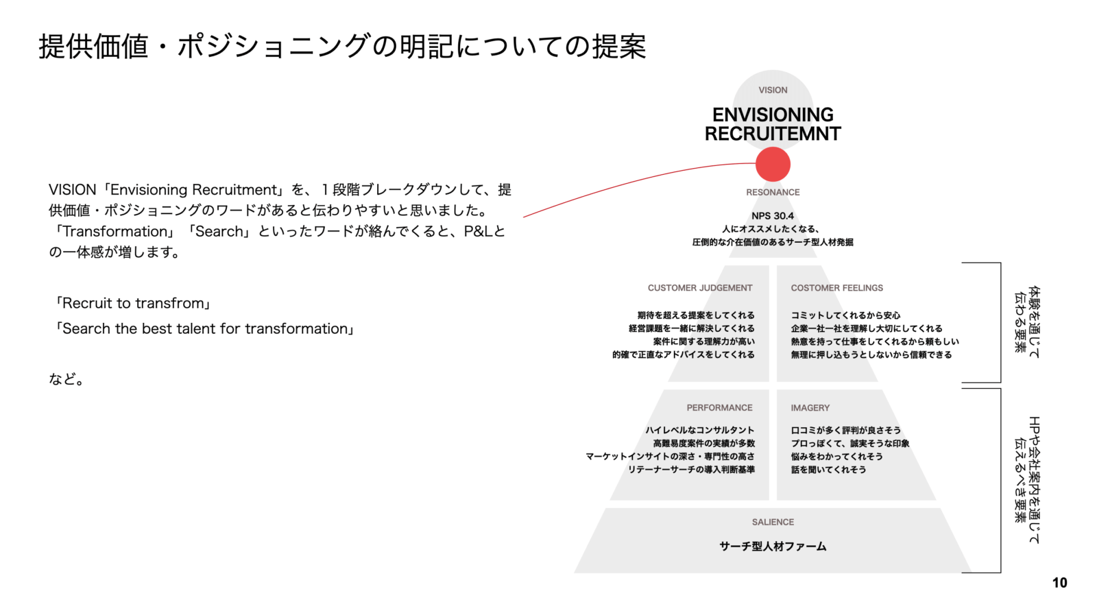 定量調査で得られた言葉や価値観の文脈を深く理解し、”価値”の細分化とモデリングを行うとともに、HPや会社案内で、リテーナーサーチ(高成果報酬サービス)に対して、ユーザの納得度を上げ、導入意向を高めるしてもらうための、訴求方法に関するインサイトを得るためです。