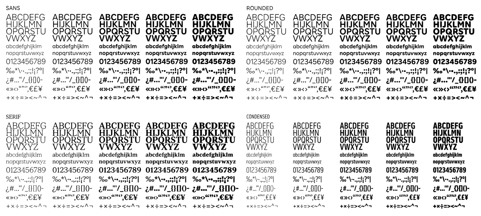 SANS、ROUNDED、SERIF、CONDENSED、ITALIC、SLABなど、幅広い選択肢の中から、社内デザイナー陣へのヒアリングなどを元に、SANS、ROUNDED、SERIF、CONDENSEDの4書体、各5ウェイトの開発を依頼することになりました。