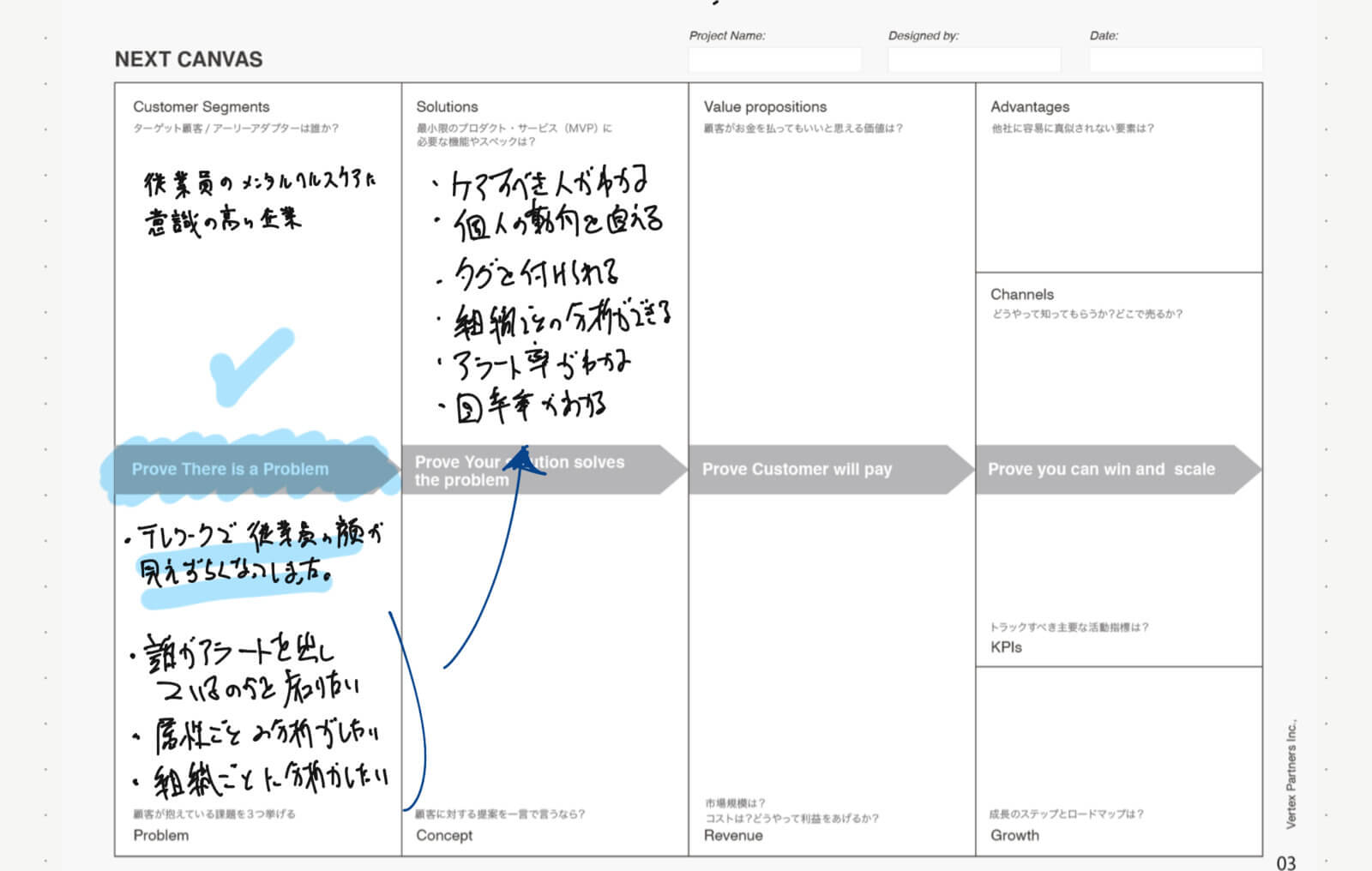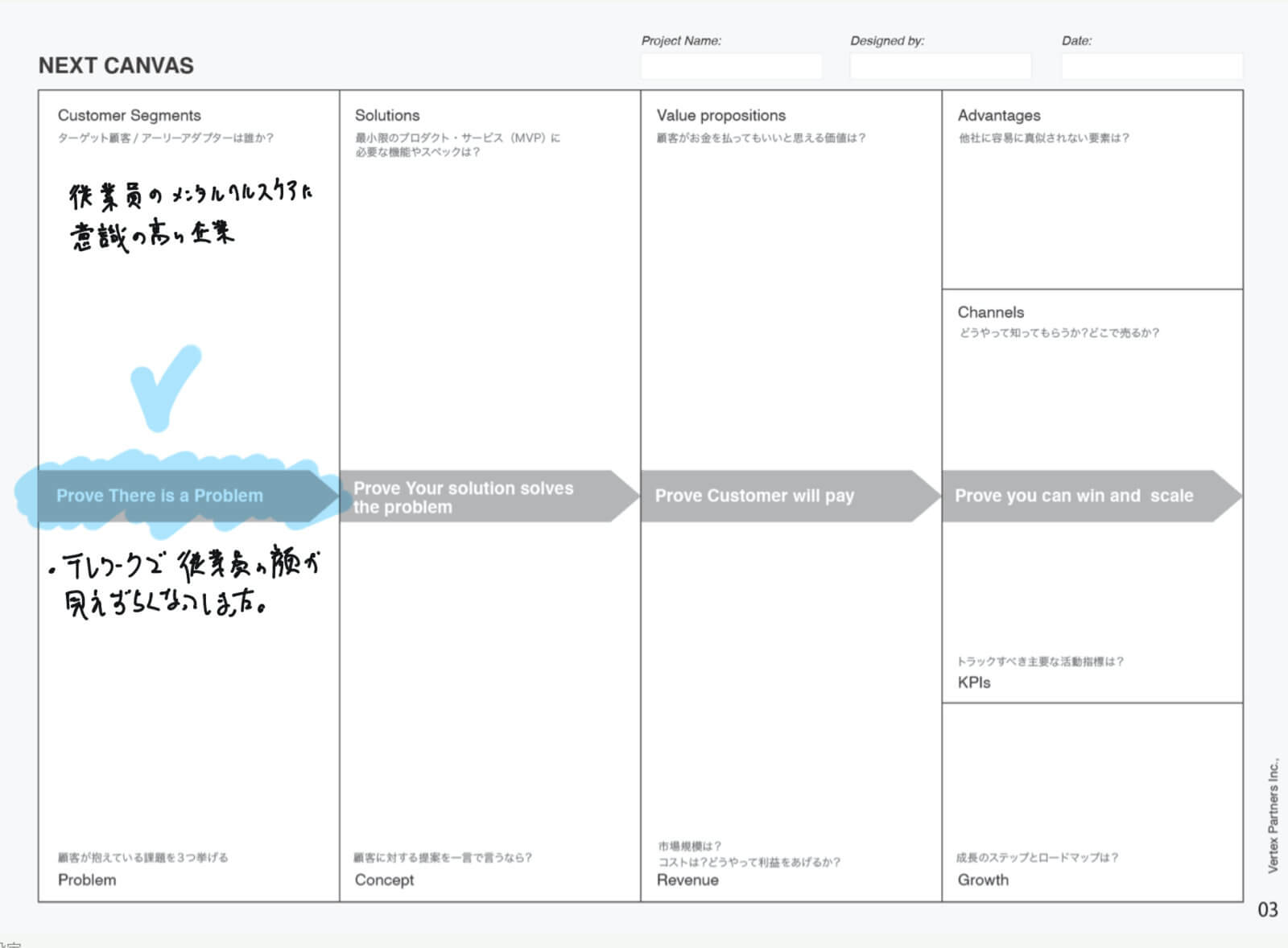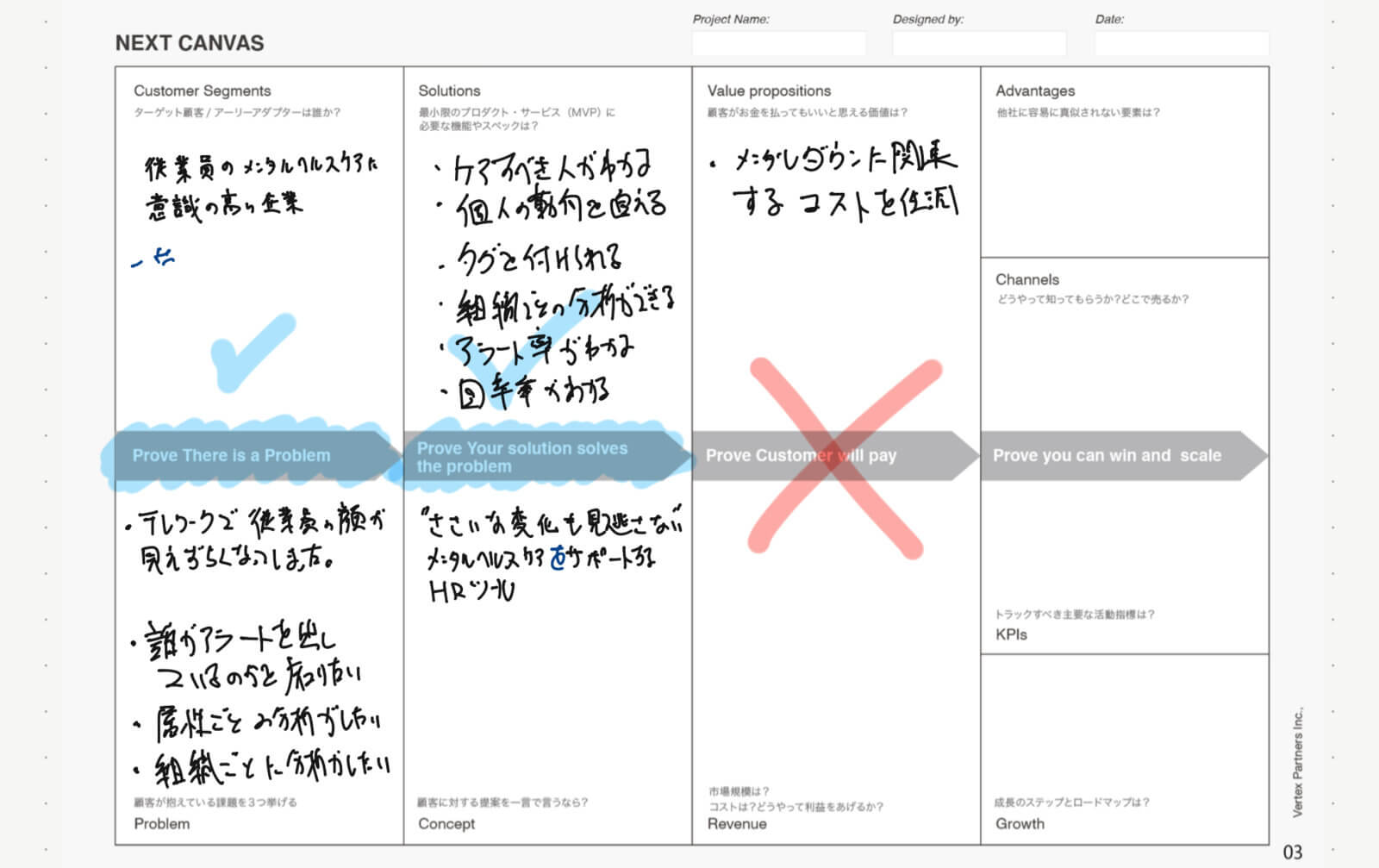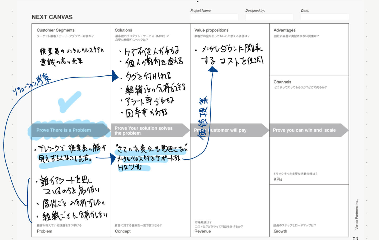 ビジネスモデルキャンバスを用いてプロジェクト期初のPlan Aを書き起こしました。
