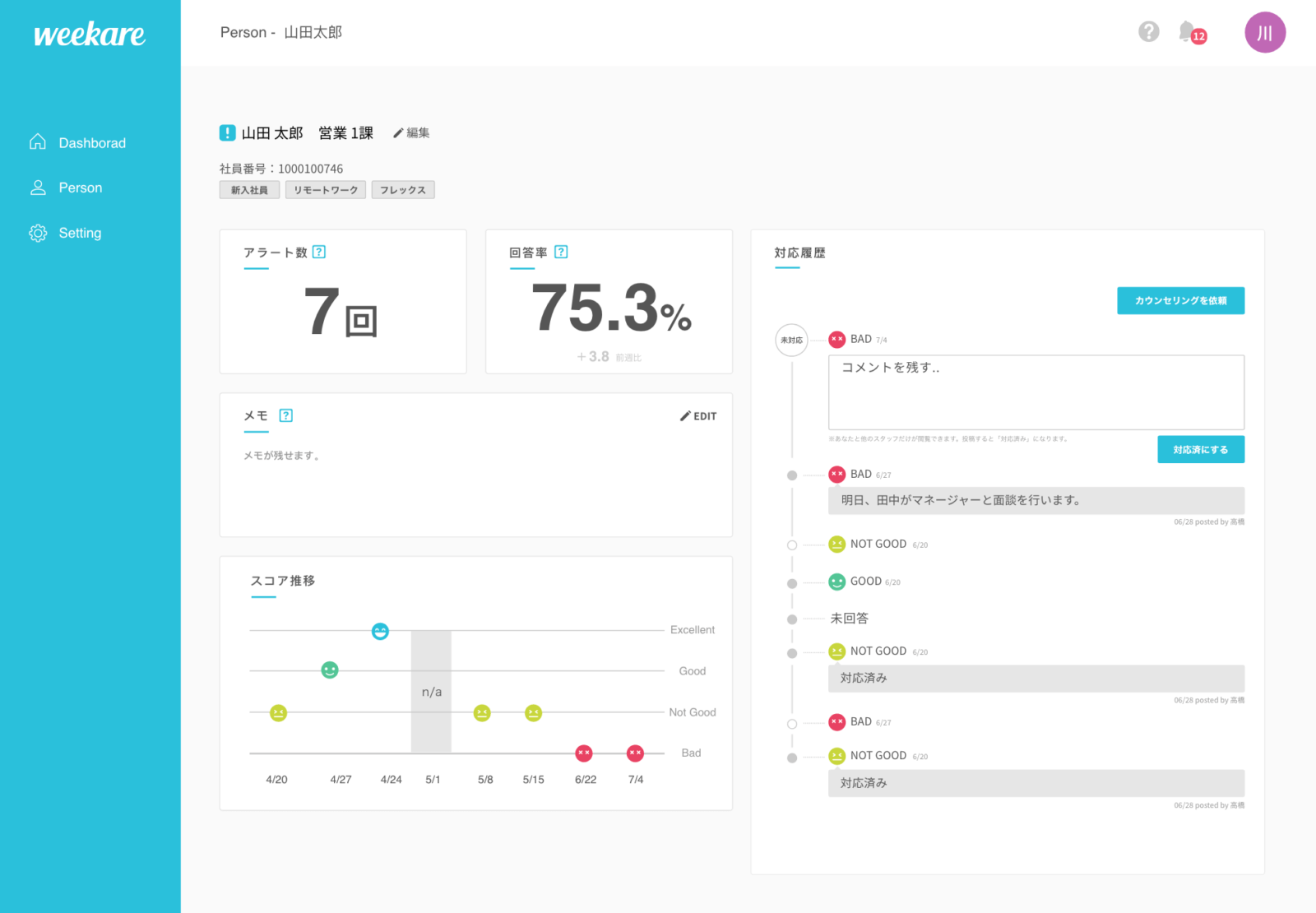 産業医を抱える規模ではない中小企業に対して、産業医による従業員のケアまでを内包するプランを提供する。アラート発信者が誰なのかわかった、でもどうしたらいいかわからないという課題を解決する。 - インタラクション機能の追加