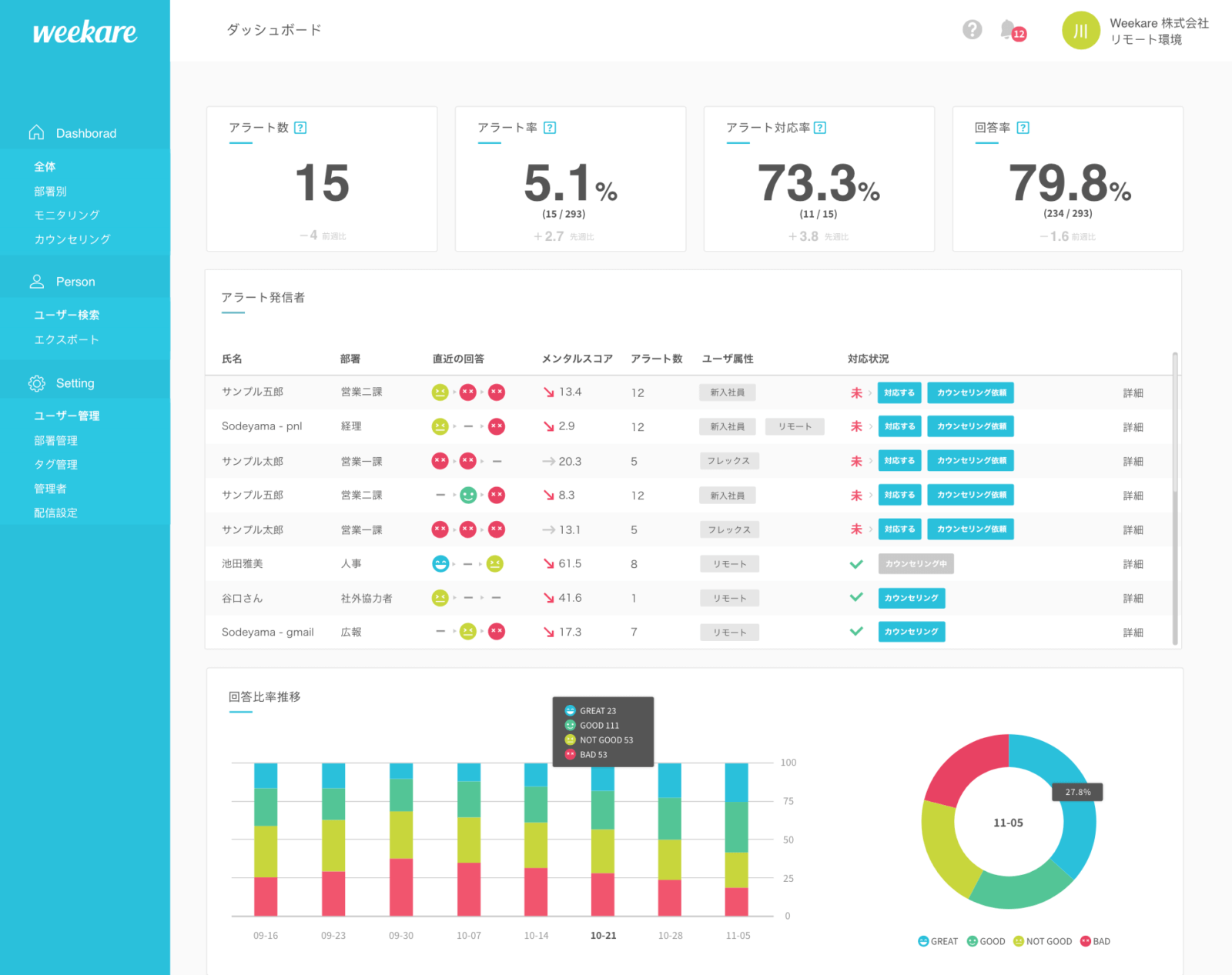 直近のアラート回数や回答率、回答推移などを確認できます。