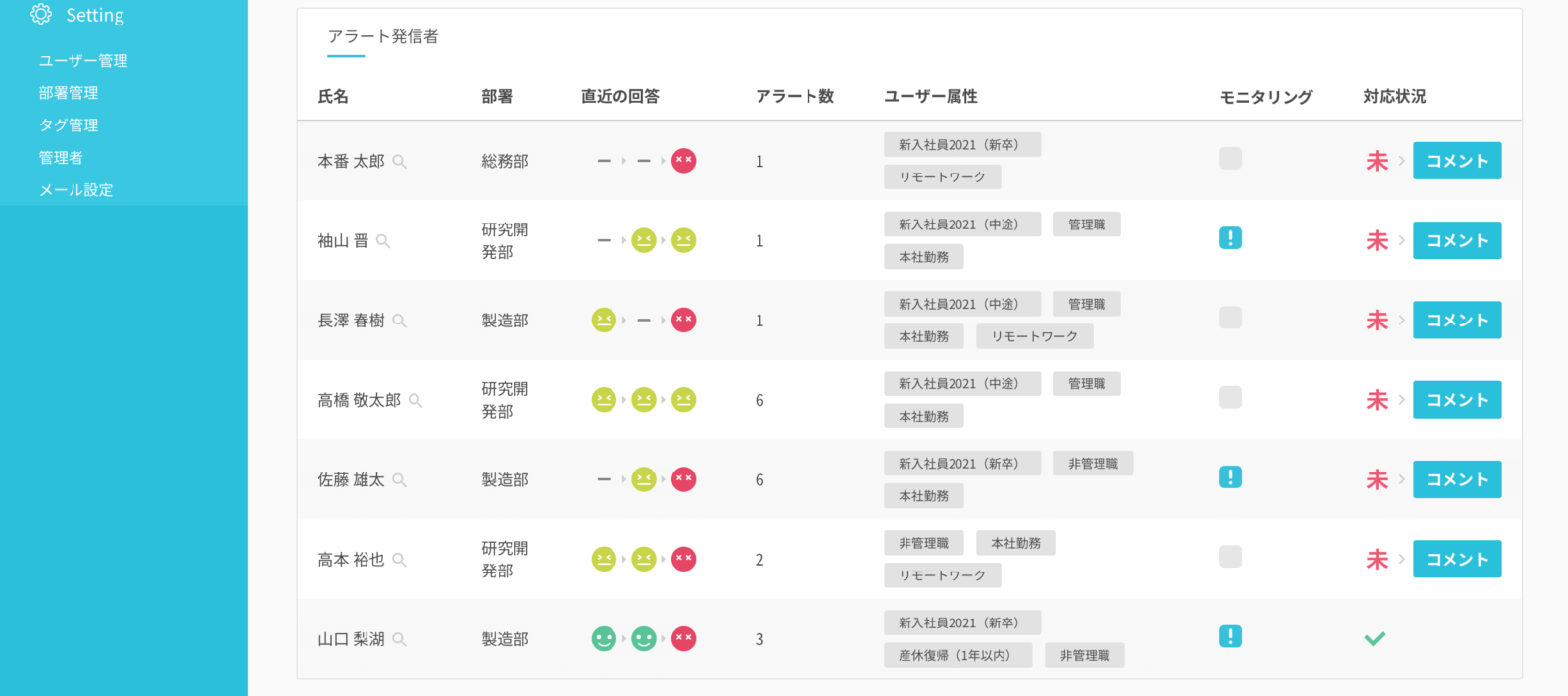 対応が必要な従業員については、コメントを残して継続的な経過観察を行うことができます。