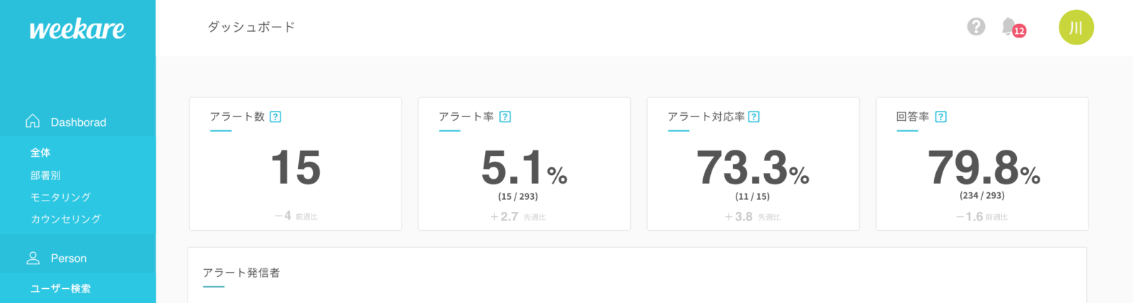 ダッシュボードのアラート発信者パネルでは、アラートを挙げている人が誰なのかを一目で把握することができます。また直近の回答推移やアラート回数なども合わせて表示することで、アラートの深刻度を判断することが楽になります。
